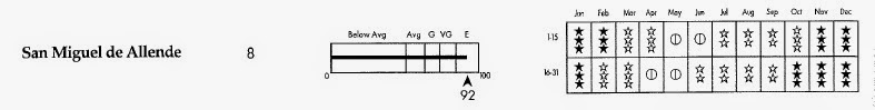 San Miguel is situated in the central mountains of Mexico at 6400 feet high, and because of this it has low humidity with sunny warm days and cool crisp nights. Winter temperatures are moderate with daily highs in the low to mid 70’s ºF (21-24 ºC) and nights in the 40’s ºF (4-9 ºC), while spring and summer temperatures average in the high 70’s to mid 80’s ºF for highs (26-29 ºC), and the mid 50’s ºF (13 ºC) for lows. The attached chart shows the weather profile of San Miguel de Allende, with 13 boxes (from 24) in the most pleasant weather category: 5 boxes correspond to the category “warm -less rain and clouds” (3-white stars) and 8 boxes to “mild – less rain and clouds” (3-black stars). From the total aggregation results the final score of 92.
